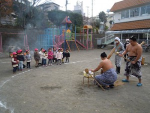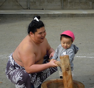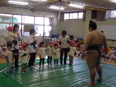 幼稚園生のお友だちがお相撲さんとたたかった後、