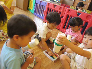 リトミック♪ 2015/08/05 まずは「やきいもジャンケン」 「次は負けないぞ~」と みんなやる気満々です ヒラヒラちょうちょになって 曲が止まったら手を横に伸ばしてバランス みんな がんばりました 紙コップに豆を入れてマラカスを作りました。 「どんぐりころころ」の歌に合わせ、シャカシャカとリズムに乗って演奏しました Posted by weepeeみもみ
