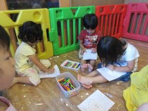 アルファベットのA-aから始まるありさん、りんご、きのこの塗り絵やファニィフェイスの塗り絵をしました![]()